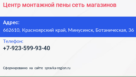 Центр монтажной пены, сеть магазинов по адресу 662610, Красноярский край, Минусинск, Ботаническая, 36 в дальнейшем Организация, размещена в следующих категориях: