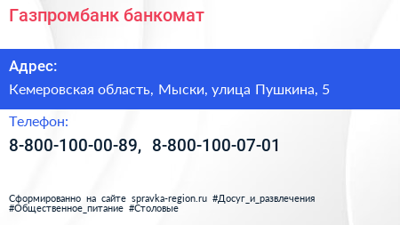 Газпромбанк, банкомат по адресу Кемеровская область, Мыски, улица Пушкина, 5 в дальнейшем Организация, размещена в следующих категориях: