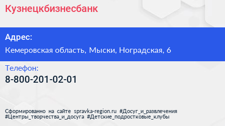 Кузнецкбизнесбанк по адресу Кемеровская область, Мыски, Ноградская, 6 в дальнейшем Организация, размещена в следующих категориях: