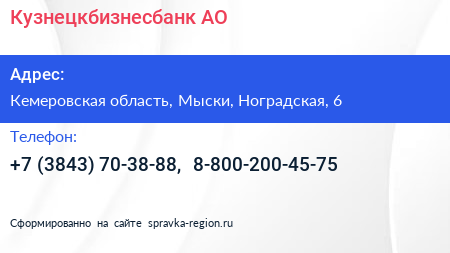 Кузнецкбизнесбанк , АО по адресу Кемеровская область, Мыски, Ноградская, 6 в дальнейшем Организация, размещена в следующих категориях: