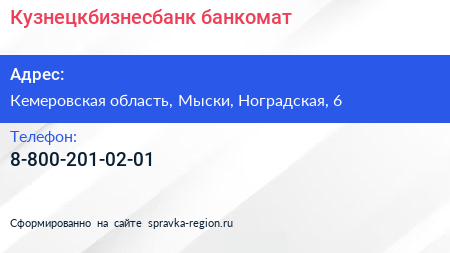 Кузнецкбизнесбанк, банкомат по адресу Кемеровская область, Мыски, Ноградская, 6 в дальнейшем Организация, размещена в следующих категориях: