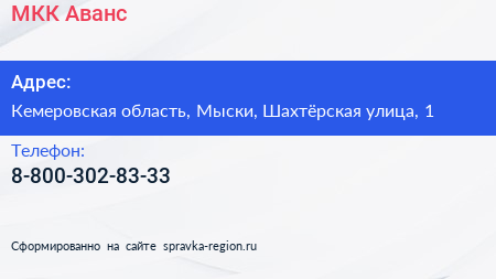 МКК Аванс по адресу Кемеровская область, Мыски, Шахтёрская улица, 1 в дальнейшем Организация, размещена в следующих категориях: