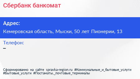 Сбербанк, банкомат по адресу Кемеровская область, Мыски, 50 лет Пионерии, 13 в дальнейшем Организация, размещена в следующих категориях:
