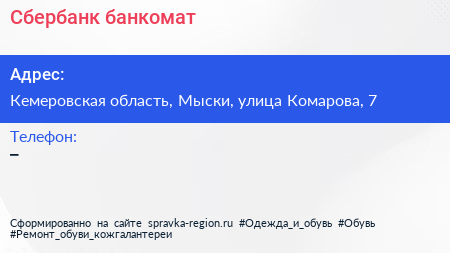 Сбербанк, банкомат по адресу Кемеровская область, Мыски, улица Комарова, 7 в дальнейшем Организация, размещена в следующих категориях: