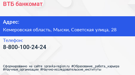 ВТБ, банкомат по адресу Кемеровская область, Мыски, Советская улица, 28 в дальнейшем Организация, размещена в следующих категориях: