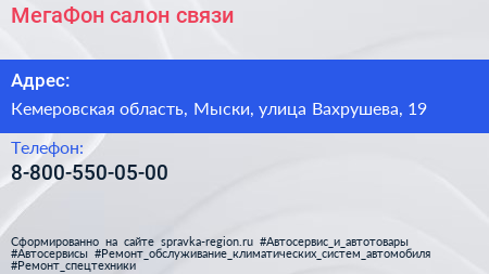 МегаФон, салон связи по адресу Кемеровская область, Мыски, улица Вахрушева, 19 в дальнейшем Организация, размещена в следующих категориях: