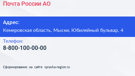 Почта России, АО по адресу Кемеровская область, Мыски, Юбилейный бульвар, 4 в дальнейшем Организация, размещена в следующих категориях: