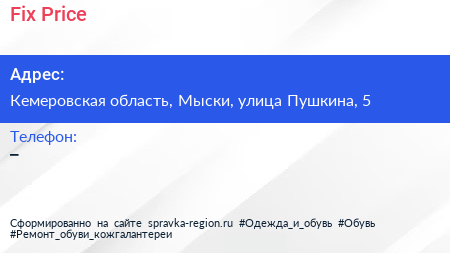 Fix Price по адресу Кемеровская область, Мыски, улица Пушкина, 5 в дальнейшем Организация, размещена в следующих категориях: