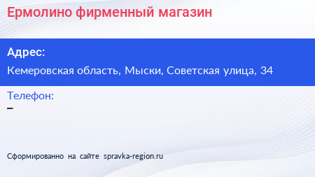 Ермолино, фирменный магазин по адресу Кемеровская область, Мыски, Советская улица, 34 в дальнейшем Организация, размещена в следующих категориях: