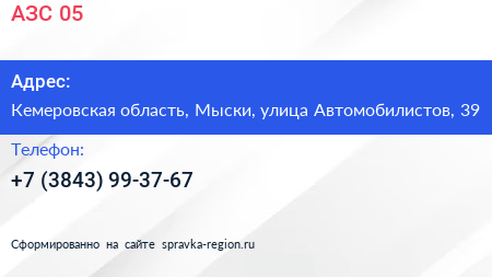 АЗС №05 по адресу Кемеровская область, Мыски, улица Автомобилистов, 39 в дальнейшем Организация, размещена в следующих категориях: