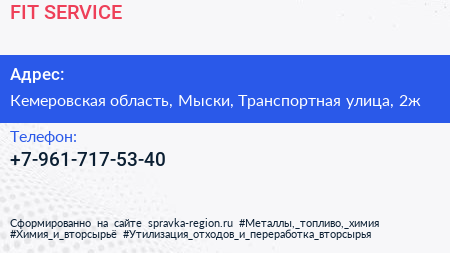 FIT SERVICE по адресу Кемеровская область, Мыски, Транспортная улица, 2ж в дальнейшем Организация, размещена в следующих категориях:
