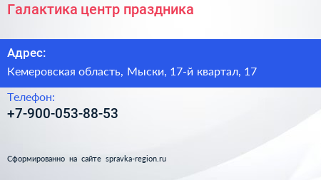 Галактика, центр праздника по адресу Кемеровская область, Мыски, 17-й квартал, 17 в дальнейшем Организация, размещена в следующих категориях: