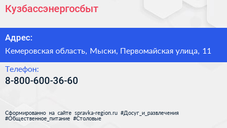 Кузбассэнергосбыт по адресу Кемеровская область, Мыски, Первомайская улица, 11 в дальнейшем Организация, размещена в следующих категориях: