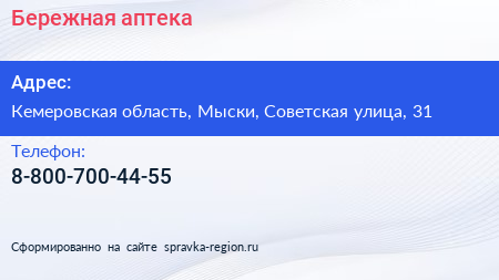 Бережная аптека по адресу Кемеровская область, Мыски, Советская улица, 31 в дальнейшем Организация, размещена в следующих категориях:
