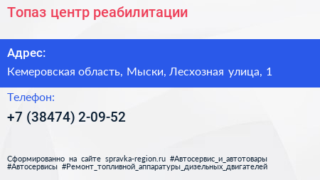 Топаз, центр реабилитации по адресу Кемеровская область, Мыски, Лесхозная улица, 1 в дальнейшем Организация, размещена в следующих категориях: