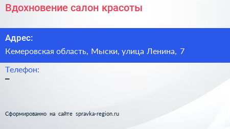 Вдохновение, салон красоты по адресу Кемеровская область, Мыски, улица Ленина, 7 в дальнейшем Организация, размещена в следующих категориях: