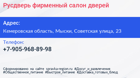 Русдверь, фирменный салон дверей по адресу Кемеровская область, Мыски, Советская улица, 23 в дальнейшем Организация, размещена в следующих категориях: