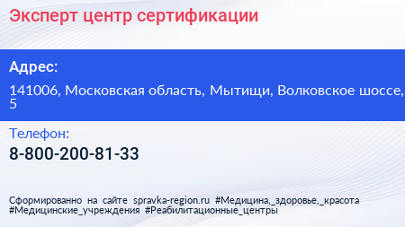 Эксперт, центр сертификации по адресу 141006, Московская область, Мытищи, Волковское шоссе, 5 в дальнейшем Организация, размещена в следующих категориях: