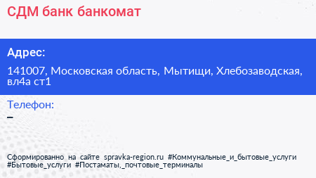 СДМ-банк, банкомат по адресу 141007, Московская область, Мытищи, Хлебозаводская, вл4а ст1 в дальнейшем Организация, размещена в следующих категориях: