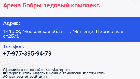 Арена Бобры, ледовый комплекс по адресу 141033, Московская область, Мытищи, Пионерская, ст2Б/1 в дальнейшем Организация, размещена в следующих категориях:
