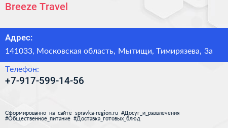 Breeze Travel по адресу 141033, Московская область, Мытищи, Тимирязева, 3а в дальнейшем Организация, размещена в следующих категориях: