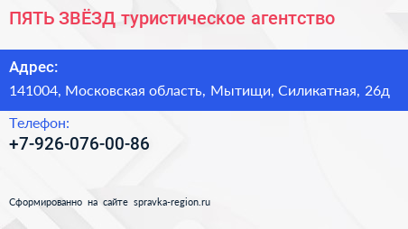 ПЯТЬ ЗВЁЗД, туристическое агентство по адресу 141004, Московская область, Мытищи, Силикатная, 26д в дальнейшем Организация, размещена в следующих категориях: