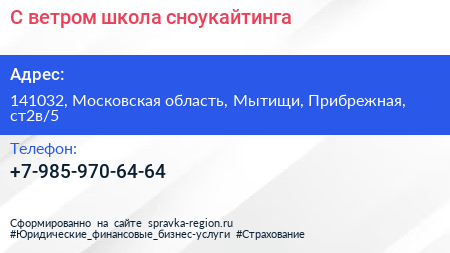 С ветром!, школа сноукайтинга по адресу 141032, Московская область, Мытищи, Прибрежная, ст2в/5 в дальнейшем Организация, размещена в следующих категориях: