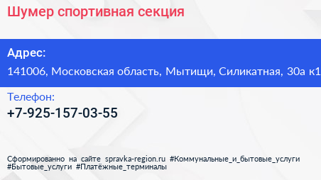Шумер, спортивная секция по адресу 141006, Московская область, Мытищи, Силикатная, 30а к1 в дальнейшем Организация, размещена в следующих категориях:
