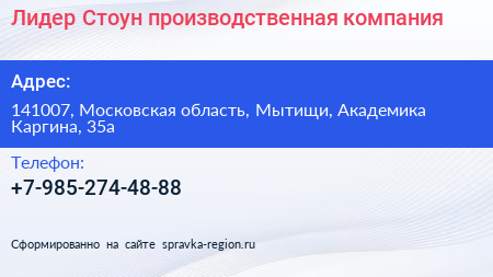 Лидер Стоун, производственная компания по адресу 141007, Московская область, Мытищи, Академика Каргина, 35а в дальнейшем Организация, размещена в следующих категориях: