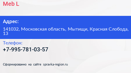 Meb-L по адресу 141032, Московская область, Мытищи, Красная Слобода, 13 в дальнейшем Организация, размещена в следующих категориях: