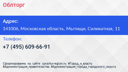 Облторг по адресу 141006, Московская область, Мытищи, Силикатная, 11 в дальнейшем Организация, размещена в следующих категориях: