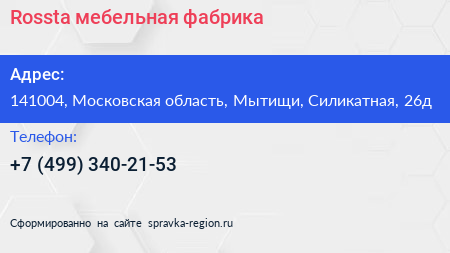 Rossta, мебельная фабрика по адресу 141004, Московская область, Мытищи, Силикатная, 26д в дальнейшем Организация, размещена в следующих категориях: