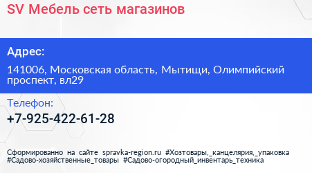 SV-Мебель, сеть магазинов по адресу 141006, Московская область, Мытищи, Олимпийский проспект, вл29 в дальнейшем Организация, размещена в следующих категориях: