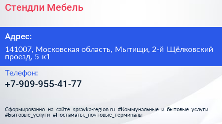 Стендли Мебель по адресу 141007, Московская область, Мытищи, 2-й Щёлковский проезд, 5 к1 в дальнейшем Организация, размещена в следующих категориях: