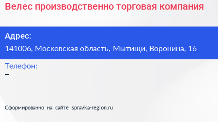 Велес, производственно-торговая компания по адресу 141006, Московская область, Мытищи, Воронина, 16 в дальнейшем Организация, размещена в следующих категориях: