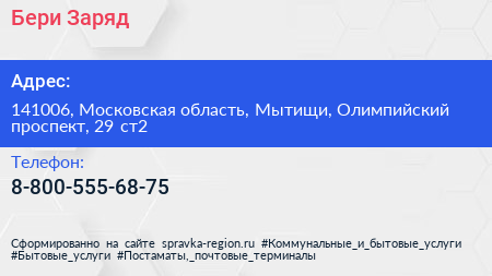 Бери Заряд! по адресу 141006, Московская область, Мытищи, Олимпийский проспект, 29 ст2 в дальнейшем Организация, размещена в следующих категориях: