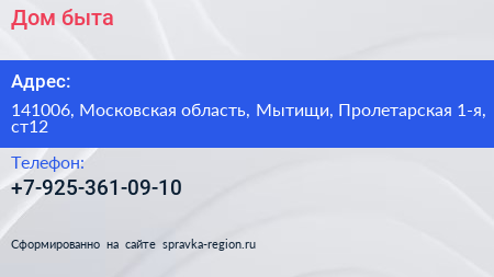 Дом быта по адресу 141006, Московская область, Мытищи, Пролетарская 1-я, ст12 в дальнейшем Организация, размещена в следующих категориях: