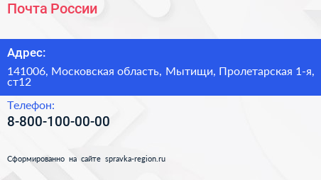 Почта России по адресу 141006, Московская область, Мытищи, Пролетарская 1-я, ст12 в дальнейшем Организация, размещена в следующих категориях: