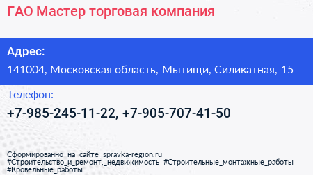 ГАО-Мастер, торговая компания по адресу 141004, Московская область, Мытищи, Силикатная, 15 в дальнейшем Организация, размещена в следующих категориях: