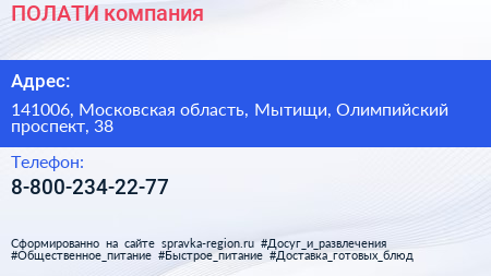 ПОЛАТИ, компания по адресу 141006, Московская область, Мытищи, Олимпийский проспект, 38 в дальнейшем Организация, размещена в следующих категориях: