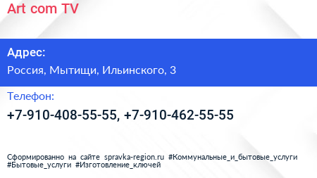 Art com TV по адресу 3, улица Ильинского, Жилой комплекс «Пироговская Ривьера», Пирогово, городской округ Мытищи, Московская область, Центральный федеральный округ, 141033, Россия в дальнейшем Организация, размещена в следующих категориях: