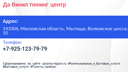 Да-Винил, тюнинг-центр по адресу 141006, Московская область, Мытищи, Волковское шоссе, 10 в дальнейшем Организация, размещена в следующих категориях: