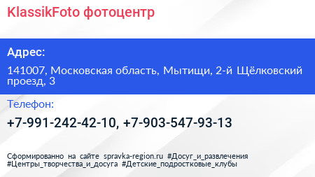 KlassikFoto, фотоцентр по адресу 141007, Московская область, Мытищи, 2-й Щёлковский проезд, 3 в дальнейшем Организация, размещена в следующих категориях: