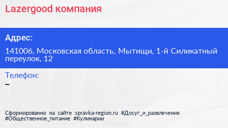Lazergood, компания по адресу 141006, Московская область, Мытищи, 1-й Силикатный переулок, 12 в дальнейшем Организация, размещена в следующих категориях: