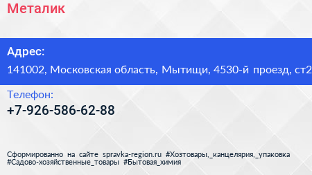 Металик по адресу 141002, Московская область, Мытищи, 4530-й проезд, ст2 в дальнейшем Организация, размещена в следующих категориях: