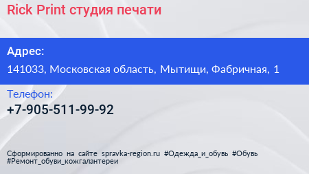 Rick Print, студия печати по адресу 141033, Московская область, Мытищи, Фабричная, 1 в дальнейшем Организация, размещена в следующих категориях: