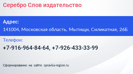 Серебро Слов, издательство по адресу 141004, Московская область, Мытищи, Силикатная, 26Б в дальнейшем Организация, размещена в следующих категориях: