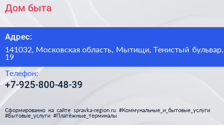 Дом быта по адресу 141032, Московская область, Мытищи, Тенистый бульвар, 19 в дальнейшем Организация, размещена в следующих категориях: