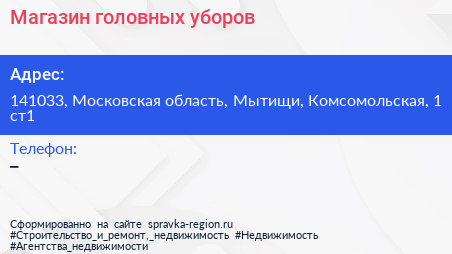 Магазин головных уборов по адресу 141033, Московская область, Мытищи, Комсомольская, 1 ст1 в дальнейшем Организация, размещена в следующих категориях: