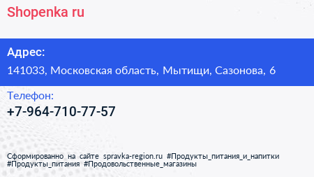 Shopenka.ru по адресу 141033, Московская область, Мытищи, Сазонова, 6 в дальнейшем Организация, размещена в следующих категориях:
